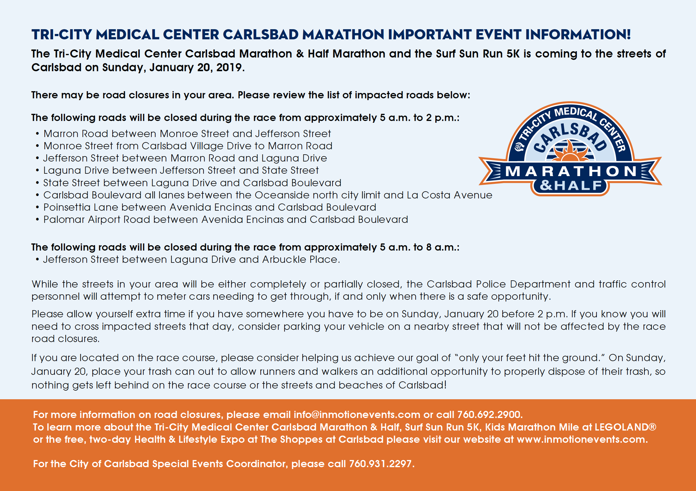 The Parks & Recreation Department recently permitted the annual Tri-City Medical Center Carlsbad Marathon & Half Marathon and Surf Sun Run 5K, which takes place this Sunday. The event attracts more than 9,000 runners and includes a two-day Health & Lifestyle Expo on Friday and Saturday, and the Kids Marathon Mile on Saturday. A list of temporary road closures may be found here.